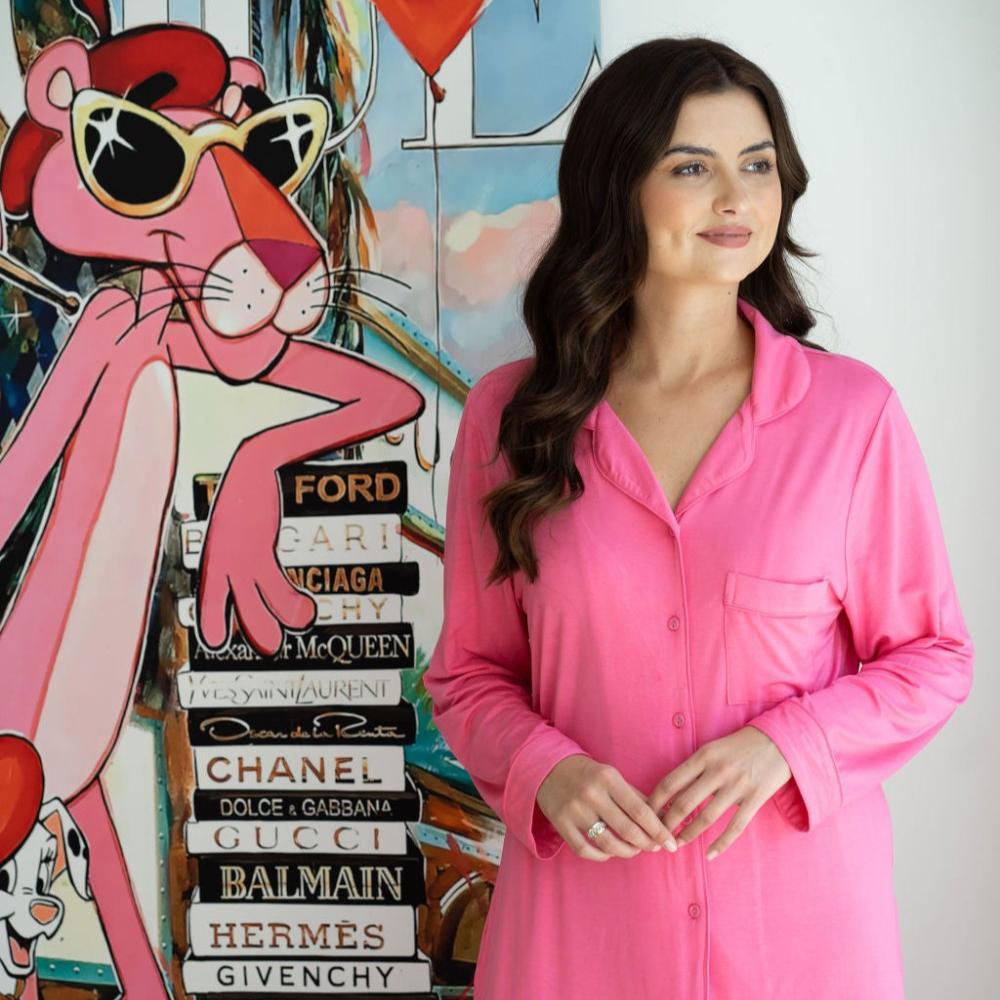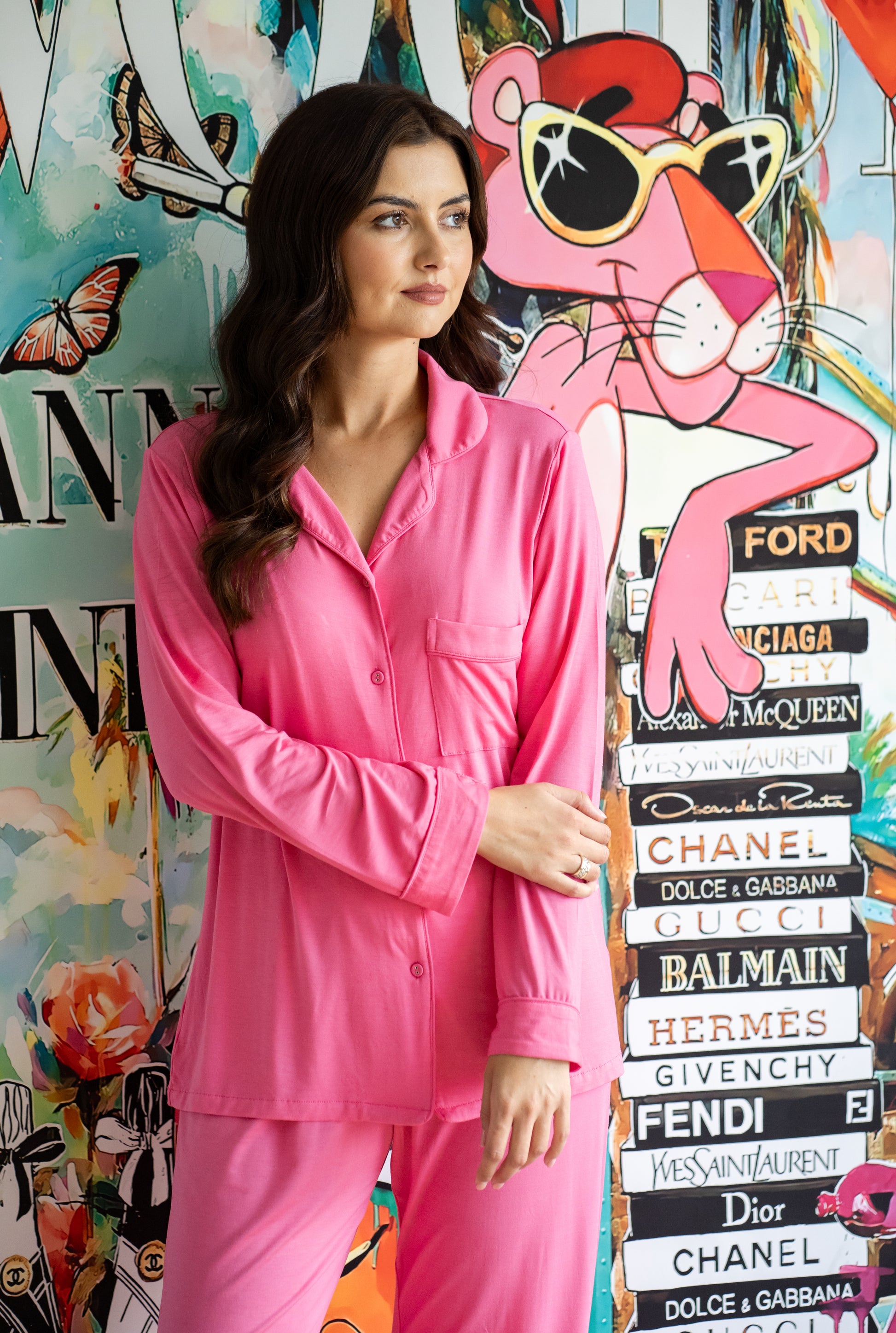The Pink Panther pyjama set brings a playful and bold touch to your sleepwear collection with its vibrant pink shade. Crafted from ultra-soft modal fabric, this set features a relaxed-fit top with a stylish scoop neckline and matching trousers with a comfortable elastic waistband. The lively pink colour, reminiscent of the iconic and adventurous Pink Panther, adds a fun and dynamic flair to your loungewear. Perfect for those who love a splash of personality and a touch of colour, the Pink Panther set ensures you stay cosy and chic, whether you're unwinding after a long day or enjoying a leisurely morning.